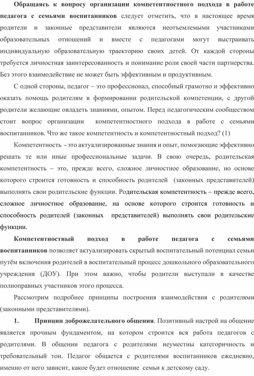 Обращаясь к вопросу организации компетентностного подхода в работе педагога с семьями воспитанников следует отметить, что в настоящее время родители и законные представители являются неотъемлемыми участниками образовательных отношений и вместе с педагогами могут выстраивать индивидуальную образовательную траекторию своих детей. От каждой стороны требуется личностная заинтересованность и понимание роли своей части партнерства. Без этого взаимодействие не может быть эффективным и продуктивным.