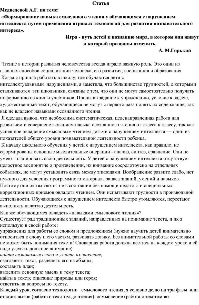 «Формирование навыка смыслового чтения у обучающихся с нарушением интеллекта путем применения игровых технологий для развития познавательного интереса».