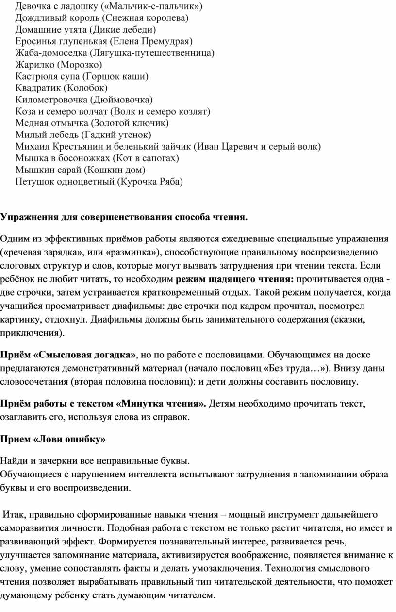 К началу школьного обучения у детей с нарушением интеллекта, как правило, не сформированы основные мыслительные операции - анализ, синтез, сравнение. Они не умеют планировать свою деятельность. У детей с нарушением интеллекта отсутствует целостное восприятие о произведении, их внимание сосредоточено на отдельных событиях, не могут установить связь между эпизодами. Воображение развито слабо, нет нужного для усвоения программного материала запаса знаний, умений и навыков. Поэтому они оказываются не в состоянии без помощи педагога и специальных коррекционных приемов овладеть чтением. Они испытывают трудности в произвольной деятельности. Обучающиеся с нарушением интеллекта быстро утомляются, перестают выполнять начатую деятельность.