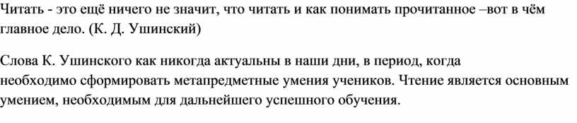 Слова К. Ушинского как никогда актуальны в наши дни, в период, когда необходимо сформировать метапредметные умения учеников. Чтение является основным умением, необходимым для дальнейшего успешного обучения.
