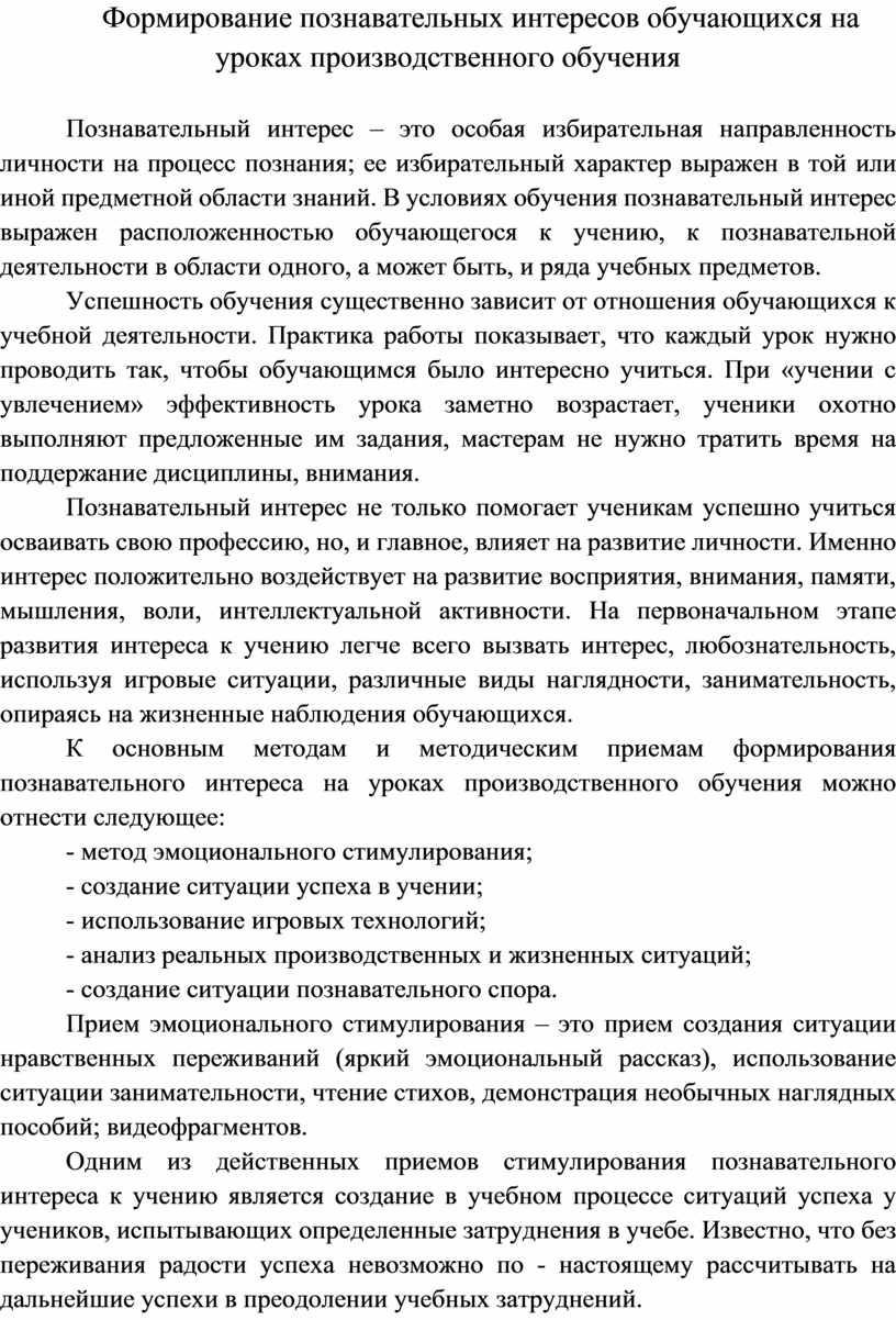 Формирование познавательных интересов обучающихся на уроках производственного обучения