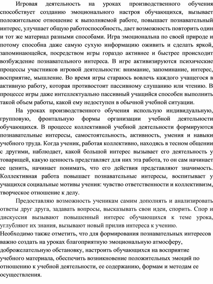 Игровая деятельность на уроках производственного обучения способствует созданию эмоционального настроя обучающихся, вызывает положительное отношение к выполняемой работе, повышает познавательный интерес, улучшает общую работоспособность, дает возможность повторить один и тот же материал разными способами. Игра эмоциональна по своей природе и потому способна даже самую сухую информацию оживить и сделать яркой, запоминающейся, посредством игры гораздо активнее и быстрее происходит возбуждение познавательного интереса. В игре активизируются психические процессы участников игровой деятельности: внимание, запоминание, интерес, восприятие, мышление. Во время игры стараюсь вовлечь каждого учащегося в активную работу, которая противостоит пассивному слушанию или чтению. В процессе игры даже интеллектуально пассивный учащийся способен выполнить такой объем работы, какой ему недоступен в обычной учебной ситуации.