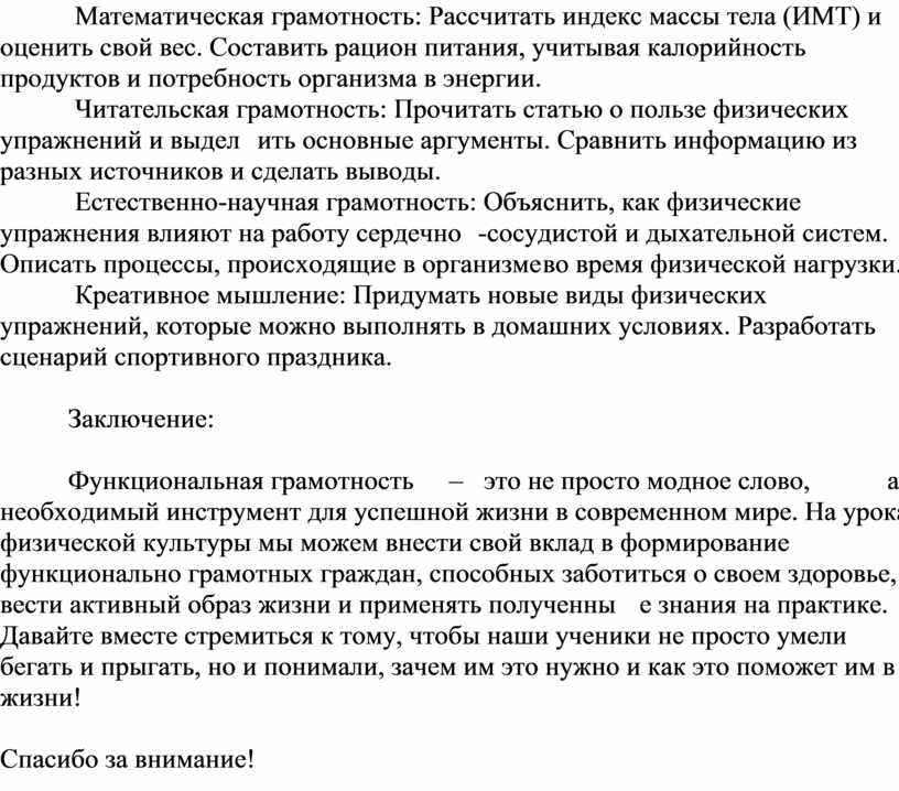 Функциональная грамотность – это не просто модное слово, а необходимый инструмент для успешной жизни в современном мире. На уроках физической культуры мы можем внести свой вклад в формирование функционально грамотных граждан, способных заботиться о своем здоровье, вести активный образ жизни и применять полученные знания на практике. Давайте вместе стремиться к тому, чтобы наши ученики не просто умели бегать и прыгать, но и понимали, зачем им это нужно и как это поможет им в жизни!