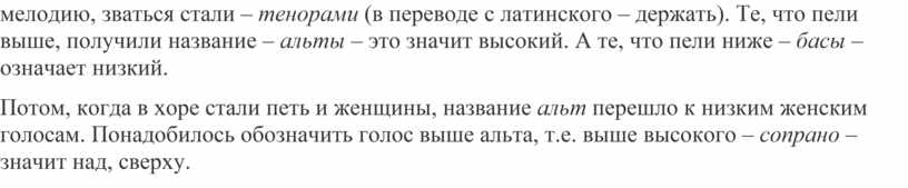 У названия голосов своя история . Сначала было так. В далеком прошлом в церковном пении женщины не принимали участия. Мужские голоса, которые держали основную мелодию, зваться стали – тенорами (в переводе с латинского – держать). Те, что пели выше, получили название – альты – это значит высокий. А те, что пели ниже – басы – означает низкий.