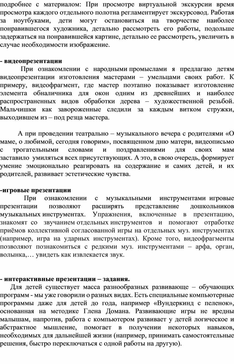 • с помощью компьютера можно смоделировать такие жизненные ситуации, которые нельзя или сложно показать в ходе НОД, либо увидеть в повседневной жизни (например, воспроизведение повадок, звуков животных; премьера спектакля знаменитой театральной труппы или экскурсия, например, в Третьяковскую галерею и т. д.).
