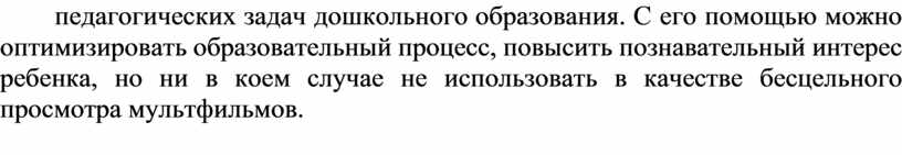 Важно, чтобы и педагоги и родители придерживались точки зрения: компьютер – это в первую очередь средство решения основных психолого-педагогических задач дошкольного образования. С его помощью можно оптимизировать образовательный процесс, повысить познавательный интерес ребенка, но ни в коем случае не использовать в качестве бесцельного просмотра мультфильмов.