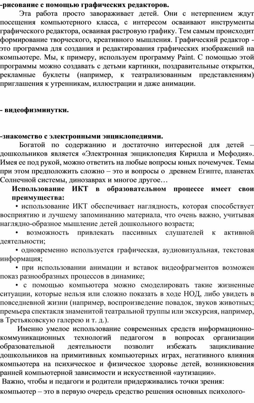 Именно умелое использование современных средств информационно-коммуникационных технологий педагогом в вопросах организации образовательной деятельности позволит избежать зацикливание дошкольников на примитивных компьютерных играх, негативного влияния компьютера на психическое и физическое здоровье детей, возникновения ранней компьютерной зависимости и искусственной «аутизации».