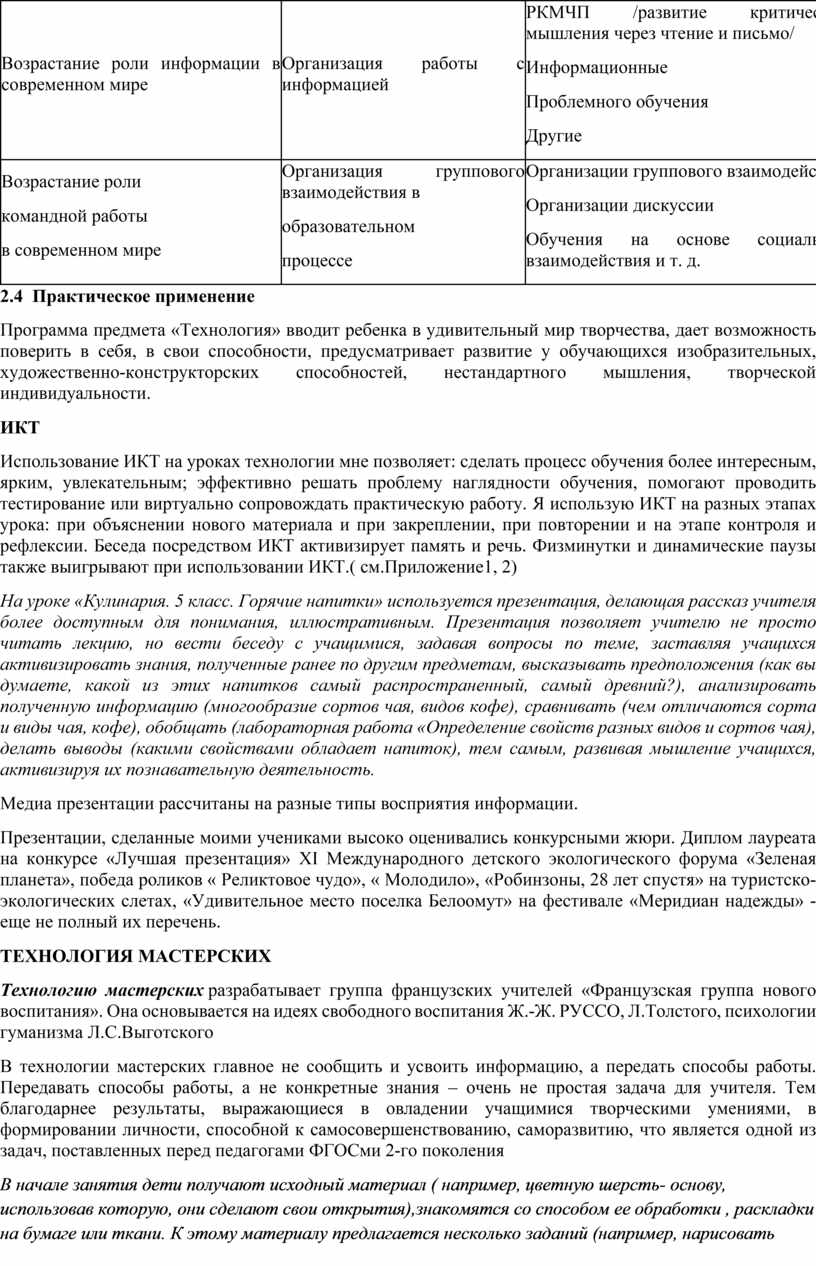 В технологии мастерских главное не сообщить и усвоить информацию, а передать способы работы. Передавать способы работы, а не конкретные знания – очень не простая задача для учителя. Тем благодарнее результаты, выражающиеся в овладении учащимися творческими умениями, в формировании личности, способной к самосовершенствованию, саморазвитию, что является одной из задач, поставленных перед педагогами ФГОСми 2-го поколения