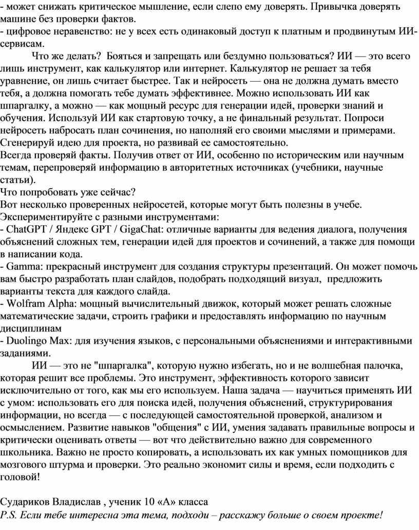 Что же делать? Бояться и запрещать или бездумно пользоваться? ИИ — это всего лишь инструмент, как калькулятор или интернет. Калькулятор не решает за тебя уравнение, он лишь считает быстрее. Так и нейросеть — она не должна думать вместо тебя, а должна помогать тебе думать эффективнее. Можно использовать ИИ как шпаргалку, а можно — как мощный ресурс для генерации идей, проверки знаний и обучения. Используй ИИ как стартовую точку, а не финальный результат. Попроси нейросеть набросать план сочинения, но наполняй его своими мыслями и примерами. Сгенерируй идею для проекта, но развивай ее самостоятельно.
