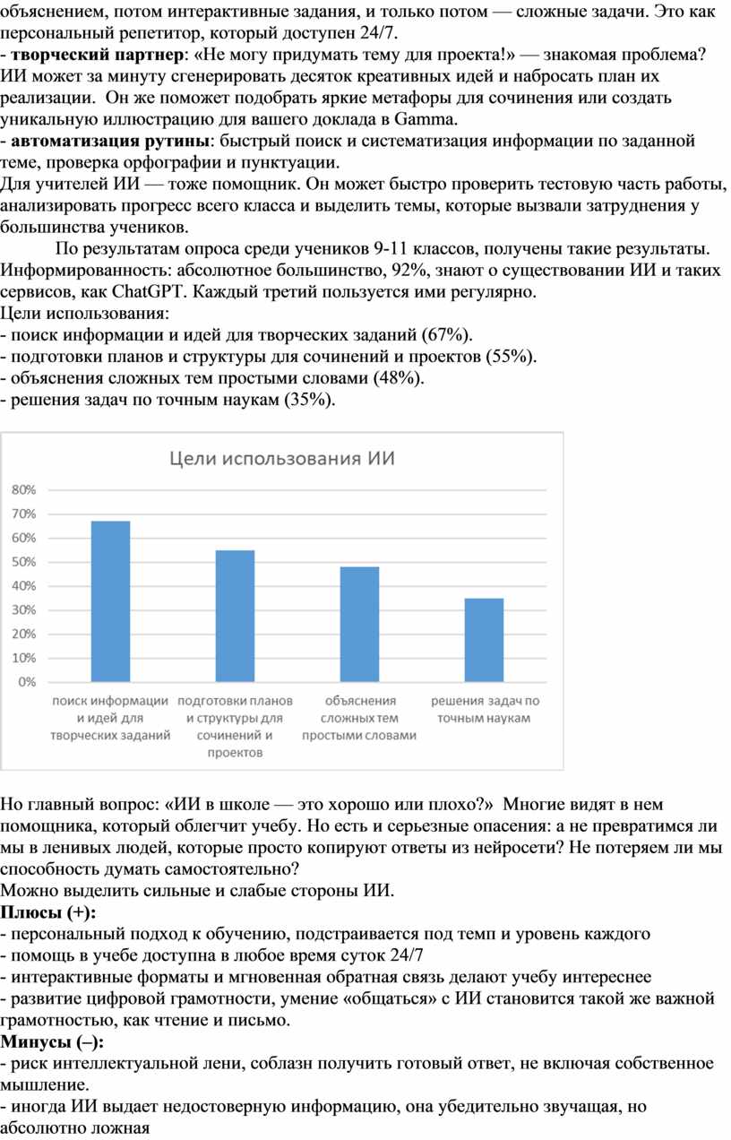 ИИ — это не "шпаргалка", которую нужно избегать, но и не волшебная палочка, которая решит все проблемы. Это инструмент, эффективность которого зависит исключительно от того, как мы его используем. Наша задача — научиться применять ИИ с умом: использовать его для поиска идей, получения объяснений, структурирования информации, но всегда — с последующей самостоятельной проверкой, анализом и осмыслением. Развитие навыков "общения" с ИИ, умения задавать правильные вопросы и критически оценивать ответы — вот что действительно важно для современного школьника. Важно не просто копировать, а использовать их как умных помощников для мозгового штурма и проверки. Это реально экономит силы и время, если подходить с головой!