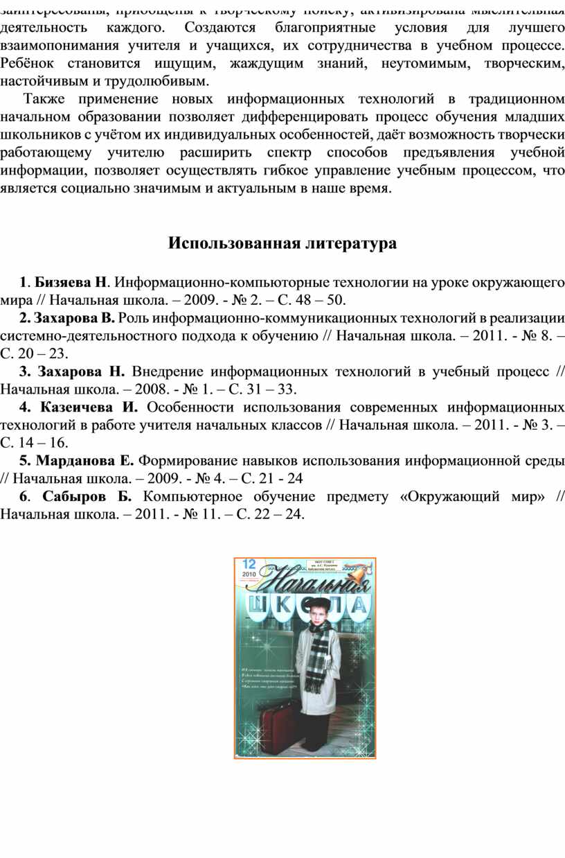 1. Бизяева Н. Информационно-компьюторные технологии на уроке окружающего мира // Начальная школа. – 2009. - № 2. – С. 48 – 50.
