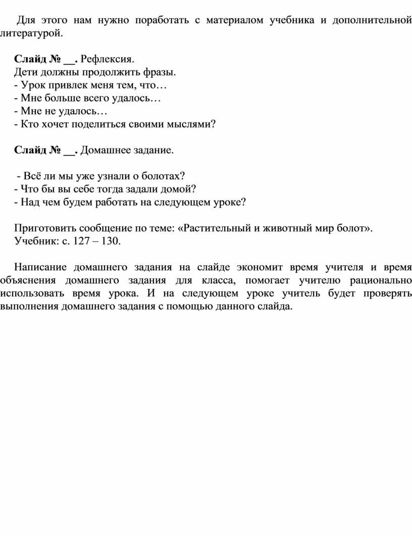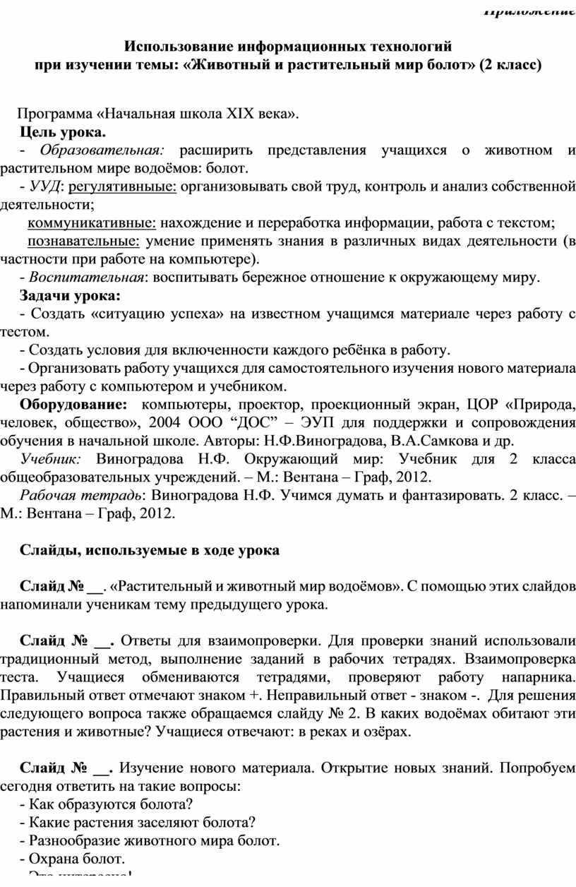 Приведу пример урока окружающего мира для 2 класса по теме: «Животный и растительный мир болот».