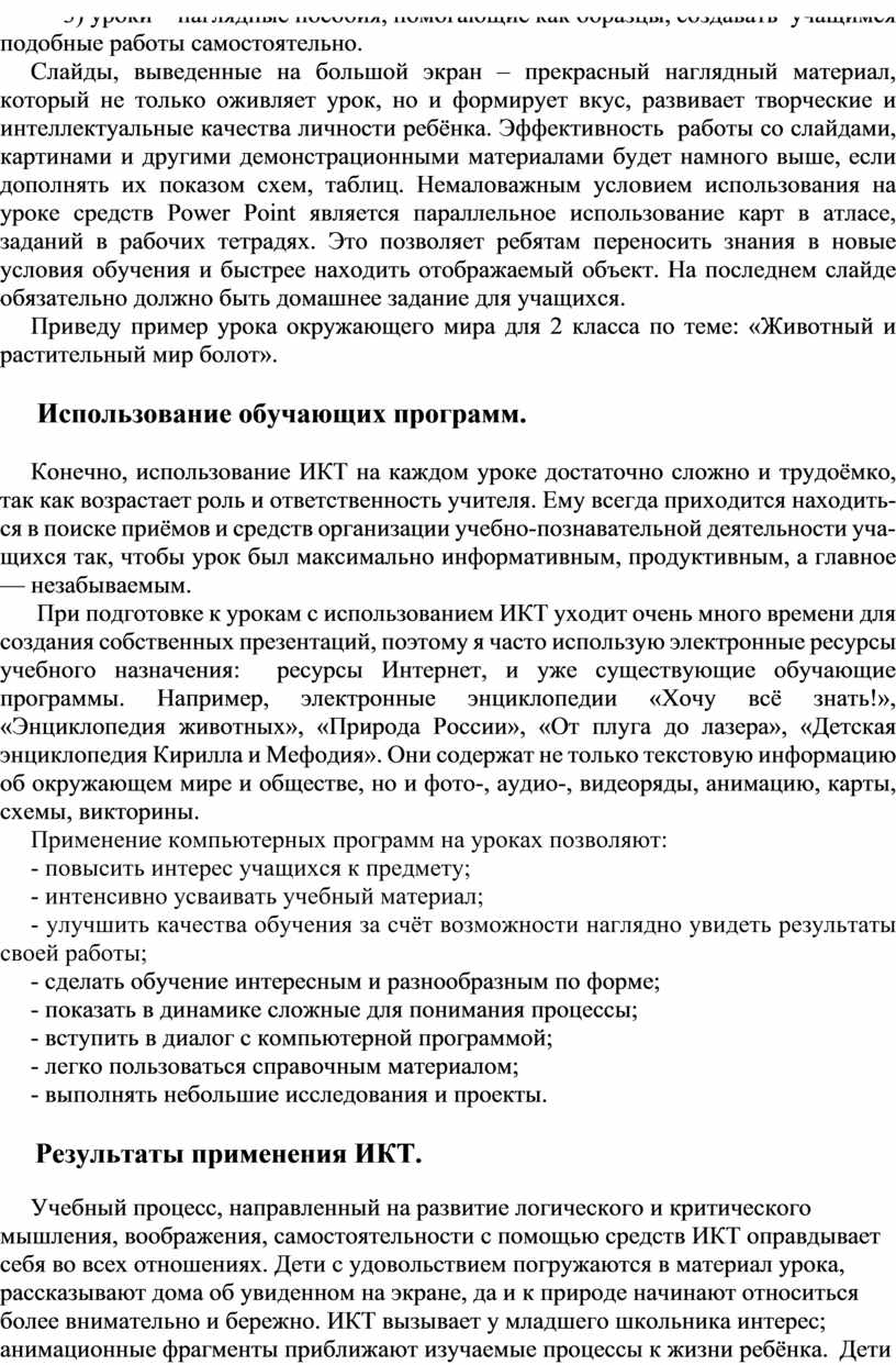 Учебный процесс, направленный на развитие логического и критического мышления, воображения, самостоятельности с помощью средств ИКТ оправдывает себя во всех отношениях. Дети с удовольствием погружаются в материал урока, рассказывают дома об увиденном на экране, да и к природе начинают относиться более внимательно и бережно. ИКТ вызывает у младшего школьника интерес; анимационные фрагменты приближают изучаемые процессы к жизни ребёнка. Дети заинтересованы, приобщены к творческому поиску; активизирована мыслительная деятельность каждого. Создаются благоприятные условия для лучшего взаимопонимания учителя и учащихся, их сотрудничества в учебном процессе. Ребёнок становится ищущим, жаждущим знаний, неутомимым, творческим, настойчивым и трудолюбивым.