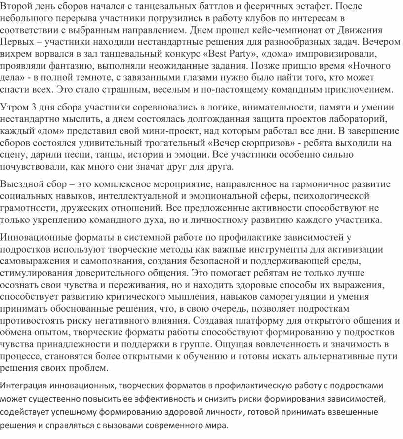 Интеграция инновационных, творческих форматов в профилактическую работу с подростками может существенно повысить ее эффективность и снизить риски формирования зависимостей, содействует успешному формированию здоровой личности, готовой принимать взвешенные решения и справляться с вызовами современного мира.
