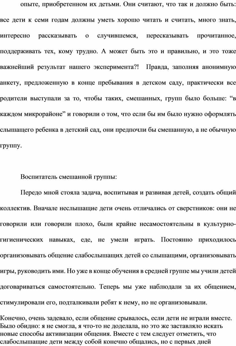 Следует особо остановиться на отношении родителей к созданию смешанной группы. Естественно, что родители детей с нарушенным слухом одобряли эту идею, им очень хотелось, чтобы дети постоянно общались со слышащими сверстниками, были среди хорошо говорящих детей (у неслышащих родителей было нейтральной отношение, для них было важно, чтобы дочка посещала детский сад и обучалась).