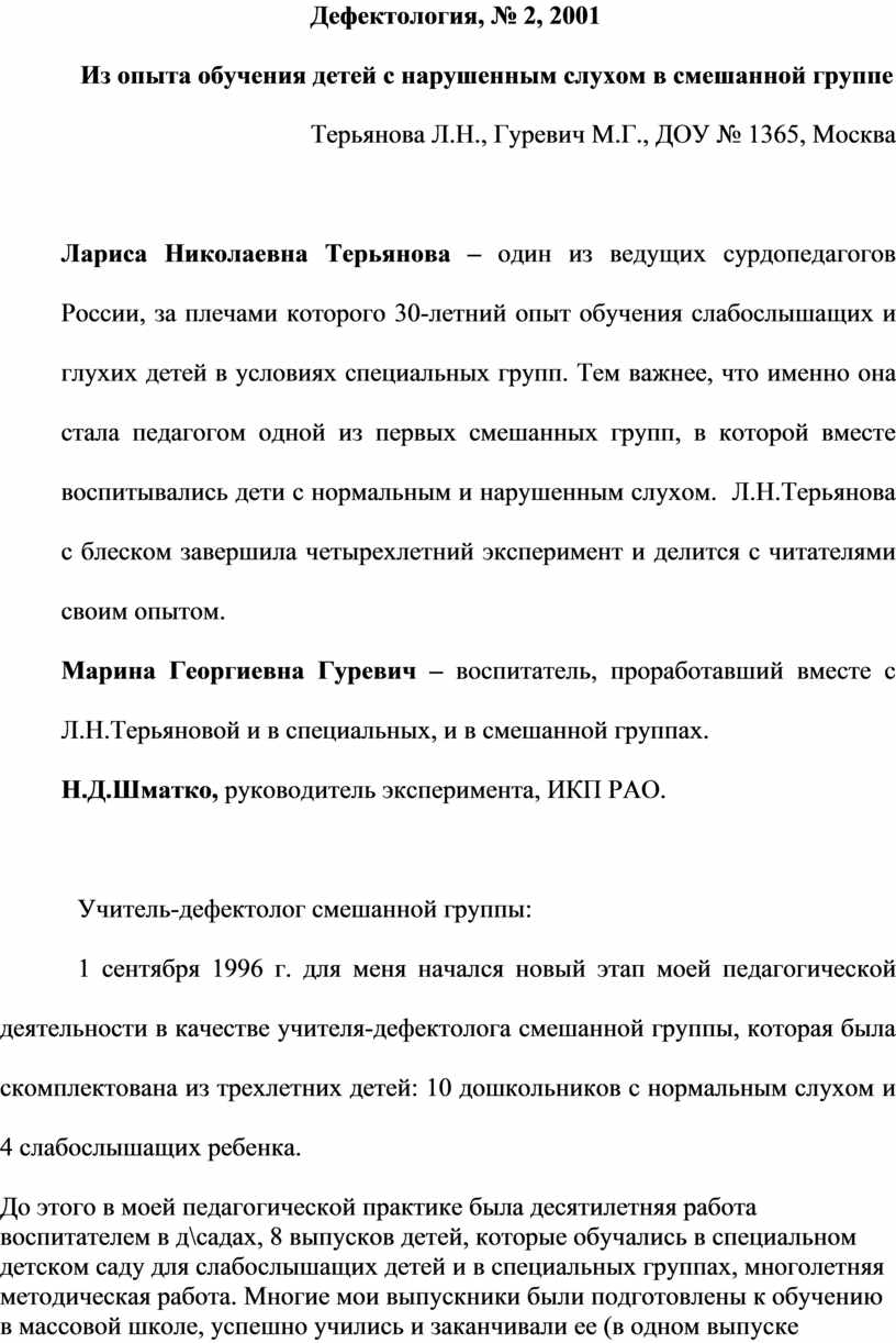 Лариса Николаевна Терьянова – один из ведущих сурдопедагогов России, за плечами которого 30-летний опыт обучения слабослышащих и глухих детей в условиях специальных групп. Тем важнее, что именно она стала педагогом одной из первых смешанных групп, в которой вместе воспитывались дети с нормальным и нарушенным слухом. Л.Н.Терьянова с блеском завершила четырехлетний эксперимент и делится с читателями своим опытом.
