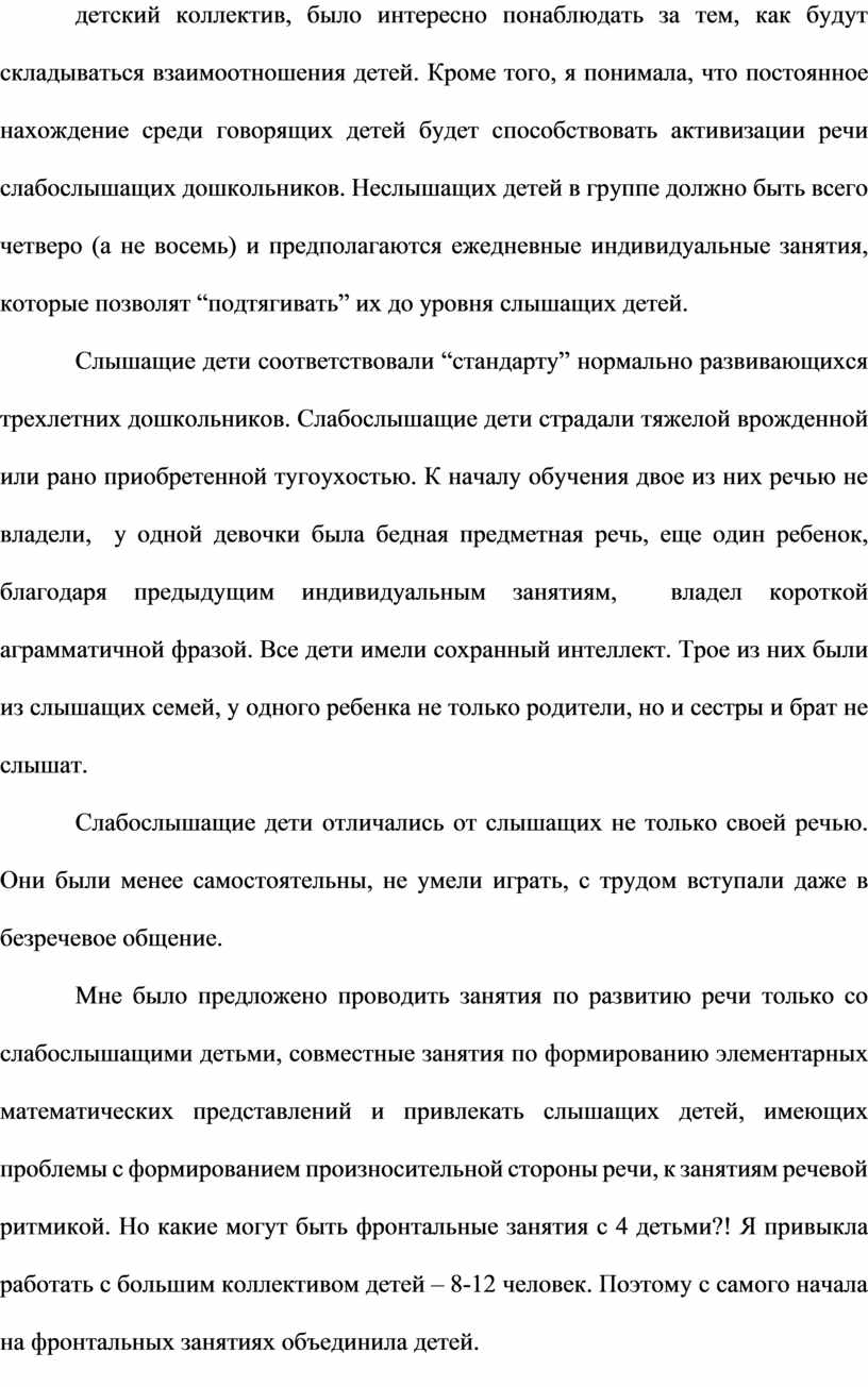 1 сентября 1996 г. для меня начался новый этап моей педагогической деятельности в качестве учителя-дефектолога смешанной группы, которая была скомплектована из трехлетних детей: 10 дошкольников с нормальным слухом и 4 слабослышащих ребенка.
