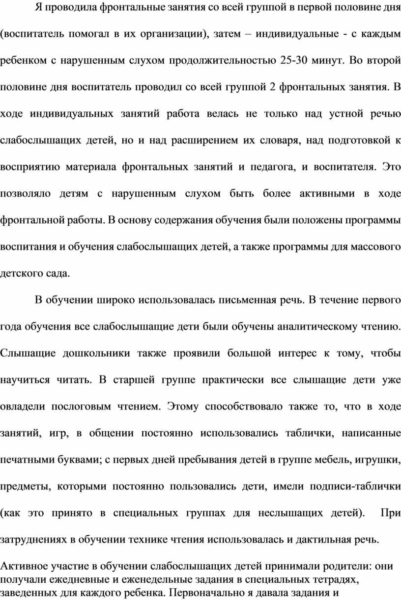 Я проводила фронтальные занятия со всей группой в первой половине дня (воспитатель помогал в их организации), затем – индивидуальные - с каждым ребенком с нарушенным слухом продолжительностью 25-30 минут. Во второй половине дня воспитатель проводил со всей группой 2 фронтальных занятия. В ходе индивидуальных занятий работа велась не только над устной речью слабослышащих детей, но и над расширением их словаря, над подготовкой к восприятию материала фронтальных занятий и педагога, и воспитателя. Это позволяло детям с нарушенным слухом быть более активными в ходе фронтальной работы. В основу содержания обучения были положены программы воспитания и обучения слабослышащих детей, а также программы для массового детского сада.