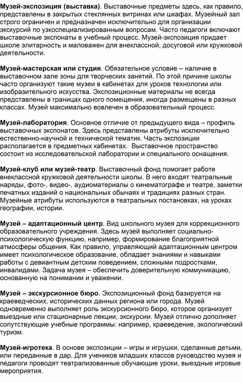 Музей-мастерская или студия. Обязательное условие – наличие в выставочном зале зоны для творческих занятий. По этой причине школы часто организуют такие музеи в кабинетах для уроков технологии или изобразительного искусства. Экспозиционные материалы не всегда представлены в границах одного помещения, иногда размещены в разных классах. Музей максимально вовлечен в образовательный процесс.