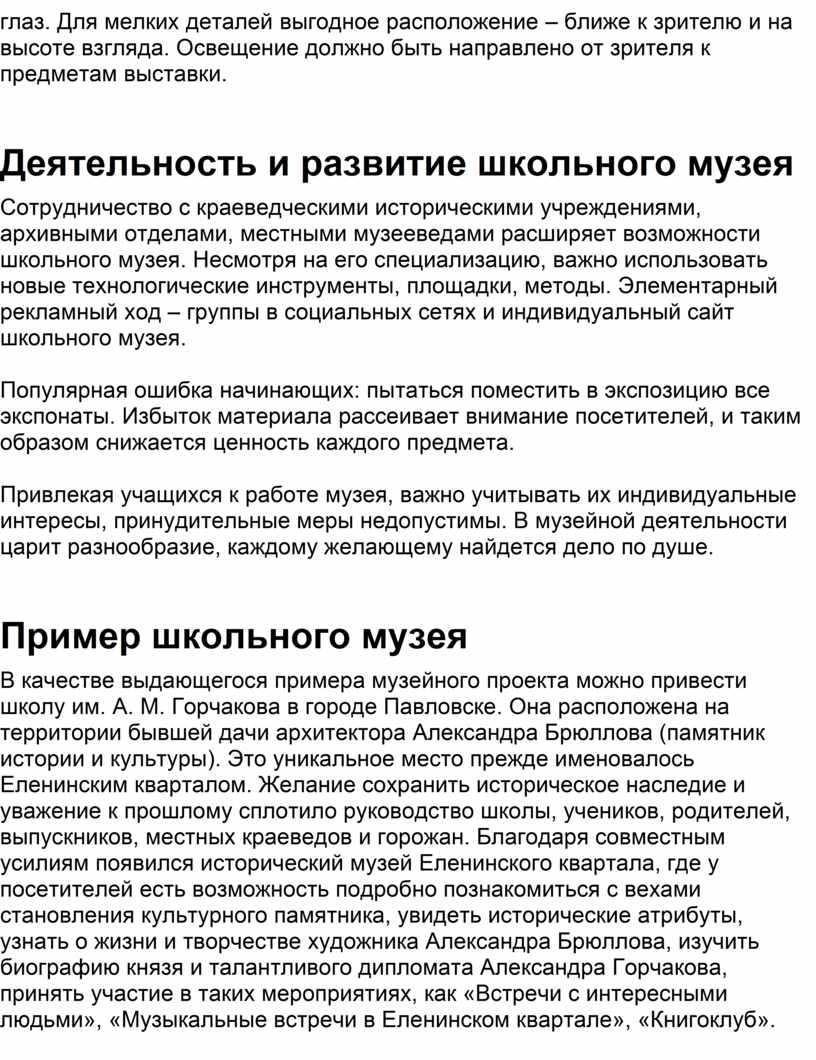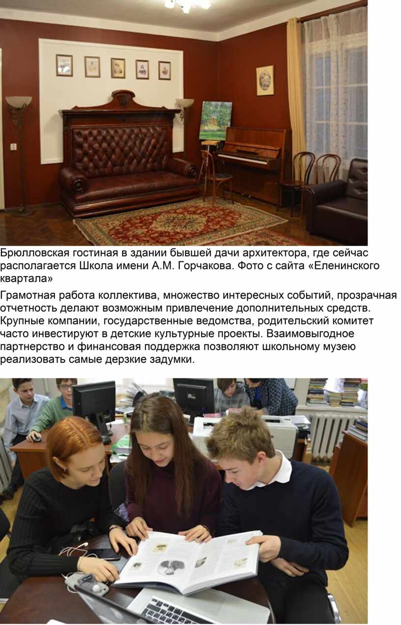 В качестве выдающегося примера музейного проекта можно привести школу им. А. М. Горчакова в городе Павловске. Она расположена на территории бывшей дачи архитектора Александра Брюллова (памятник истории и культуры). Это уникальное место прежде именовалось Еленинским кварталом. Желание сохранить историческое наследие и уважение к прошлому сплотило руководство школы, учеников, родителей, выпускников, местных краеведов и горожан. Благодаря совместным усилиям появился исторический музей Еленинского квартала, где у посетителей есть возможность подробно познакомиться с вехами становления культурного памятника, увидеть исторические атрибуты, узнать о жизни и творчестве художника Александра Брюллова, изучить биографию князя и талантливого дипломата Александра Горчакова, принять участие в таких мероприятиях, как «Встречи с интересными людьми», «Музыкальные встречи в Еленинском квартале», «Книгоклуб».
