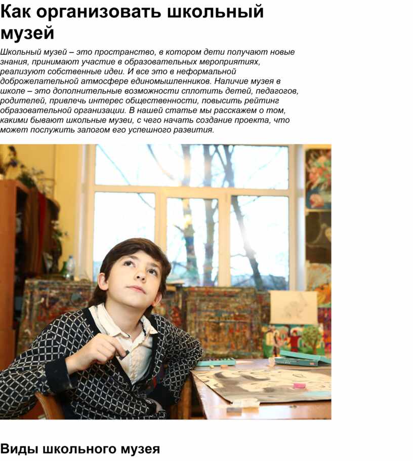 Школьный музей – это пространство, в котором дети получают новые знания, принимают участие в образовательных мероприятиях, реализуют собственные идеи. И все это в неформальной доброжелательной атмосфере единомышленников. Наличие музея в школе – это дополнительные возможности сплотить детей, педагогов, родителей, привлечь интерес общественности, повысить рейтинг образовательной организации. В нашей статье мы расскажем о том, какими бывают школьные музеи, с чего начать создание проекта, что может послужить залогом его успешного развития.