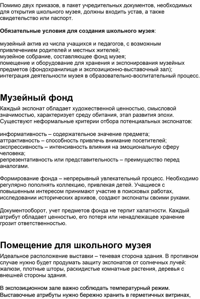 Помимо двух приказов, в пакет учредительных документов, необходимых для открытия школьного музея, должны входить устав, а также свидетельство или паспорт.
