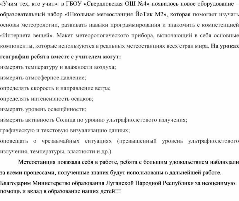 «Учим тех, кто учит»: в ГБОУ «Свердловская ОШ №4» появилось новое оборудование – образовательный набор «Школьная метеостанция ЙоТик М2», которая помогает изучать основы метеорологии, развивать навыки программирования и знакомить с компетенцией «Интернета вещей». Макет метеорологического прибора, включающий в себя основные компоненты, которые используются в реальных метеостанциях всех стран мира. На уроках географии ребята вместе с учителем могут: