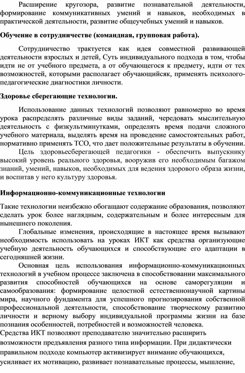 Использование данных технологий позволяют равномерно во время урока распределять различные виды заданий, чередовать мыслительную деятельность с физкультминутками, определять время подачи сложного учебного материала, выделять время на проведение самостоятельных работ, нормативно применять ТСО, что дает положительные результаты в обучении.