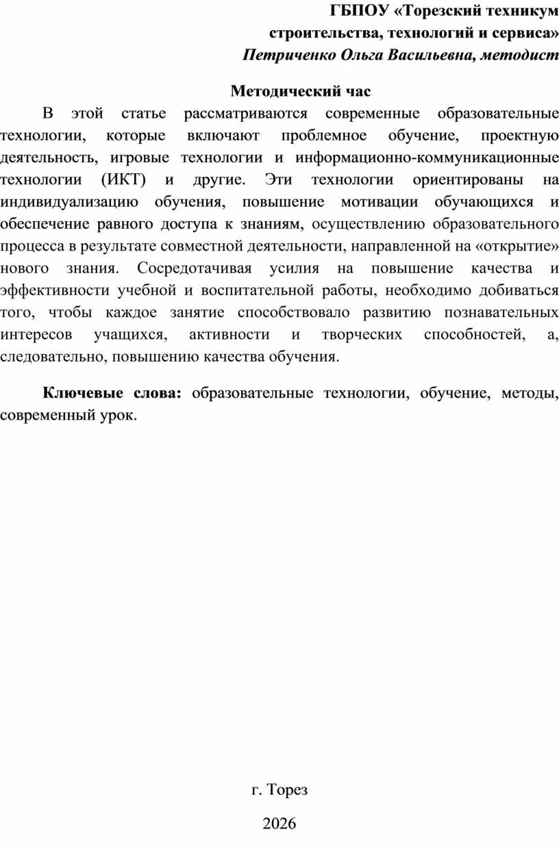Ключевые слова: образовательные технологии, обучение, методы, современный урок.