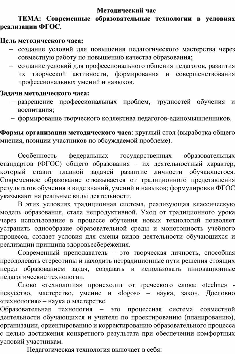 Формы организации методического часа: круглый стол (выработка общего мнения, позиции участников по обсуждаемой проблеме).
