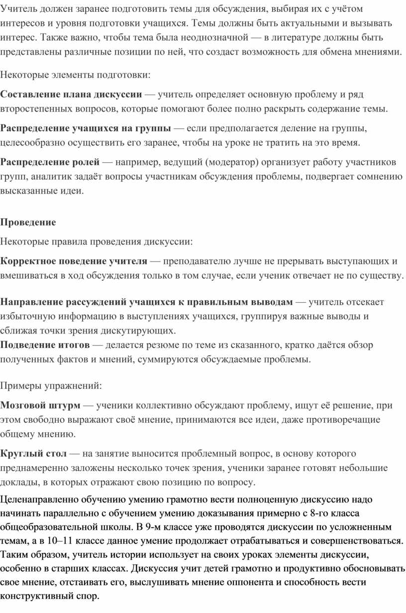 Целенаправленно обучению умению грамотно вести полноценную дискуссию надо начинать параллельно с обучением умению доказывания примерно с 8-го класса общеобразовательной школы. В 9-м классе уже проводятся дискуссии по усложненным темам, а в 10–11 классе данное умение продолжает отрабатываться и совершенствоваться. Таким образом, учитель истории использует на своих уроках элементы дискуссии, особенно в старших классах. Дискуссия учит детей грамотно и продуктивно обосновывать свое мнение, отстаивать его, выслушивать мнение оппонента и способность вести конструктивный спор.