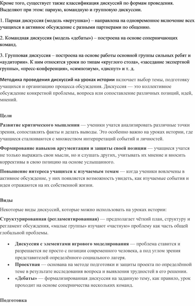 Методика проведения дискуссий на уроках истории включает выбор темы, подготовку учащихся и организацию процесса обсуждения. Дискуссия — это коллективное обсуждение конкретной проблемы, вопроса или сопоставление различных позиций, идей, мнений.