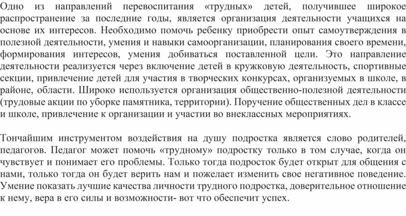 Тончайшим инструментом воздействия на душу подростка является слово родителей, педагогов. Педагог может помочь «трудному» подростку только в том случае, когда он чувствует и понимает его проблемы. Только тогда подросток будет открыт для общения с нами, только тогда он будет верить нам и пожелает изменить свое негативное поведение. Умение показать лучшие качества личности трудного подростка, доверительное отношение к нему, вера в его силы и возможности- вот что обеспечит успех.