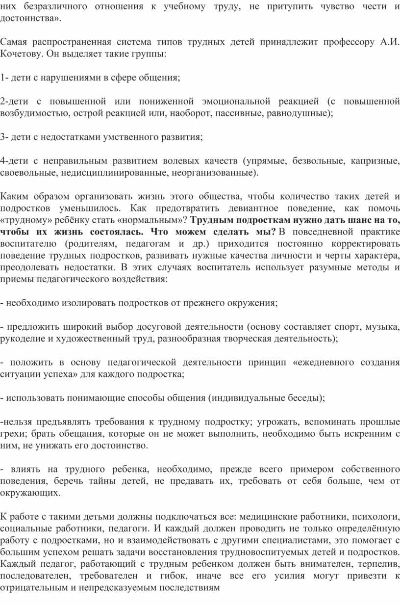 Самая распространенная система типов трудных детей принадлежит профессору А.И. Кочетову. Он выделяет такие группы: