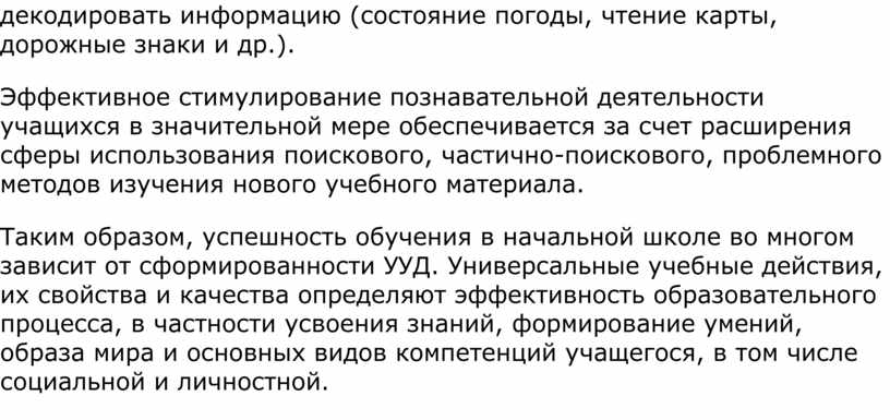 Таким образом, успешность обучения в начальной школе во многом зависит от сформированности УУД. Универсальные учебные действия, их свойства и качества определяют эффективность образовательного процесса, в частности усвоения знаний, формирование умений, образа мира и основных видов компетенций учащегося, в том числе социальной и личностной.