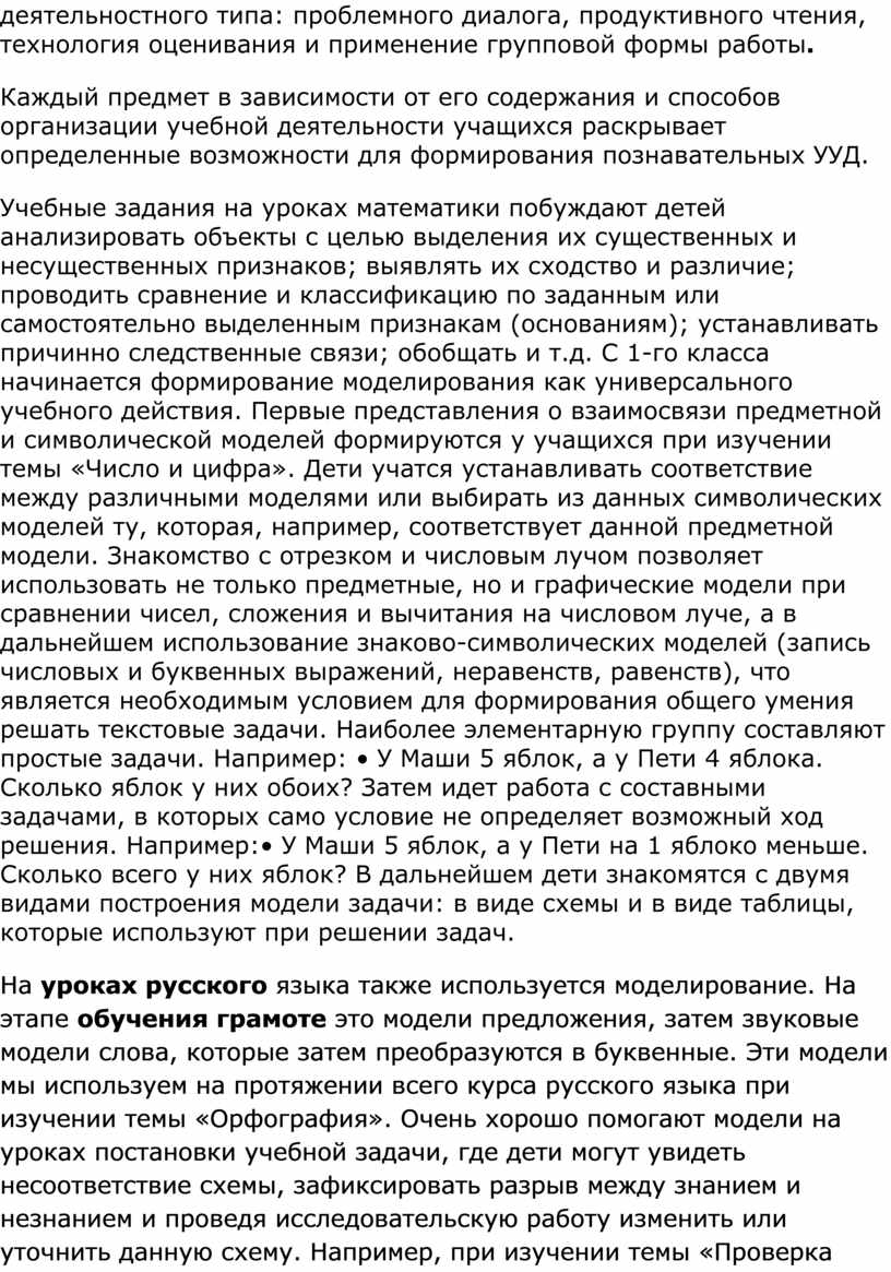 Учебные задания на уроках математики побуждают детей анализировать объекты с целью выделения их существенных и несущественных признаков; выявлять их сходство и различие; проводить сравнение и классификацию по заданным или самостоятельно выделенным признакам (основаниям); устанавливать причинно следственные связи; обобщать и т.д. С 1-го класса начинается формирование моделирования как универсального учебного действия. Первые представления о взаимосвязи предметной и символической моделей формируются у учащихся при изучении темы «Число и цифра». Дети учатся устанавливать соответствие между различными моделями или выбирать из данных символических моделей ту, которая, например, соответствует данной предметной модели. Знакомство с отрезком и числовым лучом позволяет использовать не только предметные, но и графические модели при сравнении чисел, сложения и вычитания на числовом луче, а в дальнейшем использование знаково-символических моделей (запись числовых и буквенных выражений, неравенств, равенств), что является необходимым условием для формирования общего умения решать текстовые задачи. Наиболее элементарную группу составляют простые задачи. Например: • У Маши 5 яблок, a y Пети 4 яблока. Сколько яблок у них обоих? Затем идет работа с составными задачами, в которых само условие не определяет возможный ход решения. Например:• У Маши 5 яблок, a y Пети на 1 яблоко меньше. Сколько всего у них яблок? В дальнейшем дети знакомятся с двумя видами построения модели задачи: в виде схемы и в виде таблицы, которые используют при решении задач.