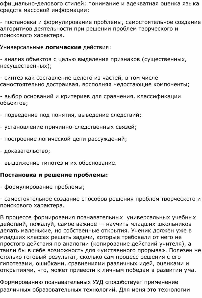 В процессе формирования познавательных универсальных учебных действий, пожалуй, самое важное — научить младших школьников делать маленькие, но собственные открытия. Ученик должен уже в младших классах решать задачи, которые требовали от него не простого действия по аналогии (копирование действий учителя), а таили бы в себе возможность для «умственного прорыва». Полезен не столько готовый результат, сколько сам процесс решения с его гипотезами, ошибками, сравнениями различных идей, оценками и открытиями, что, может привести к личным победам в развитии ума.