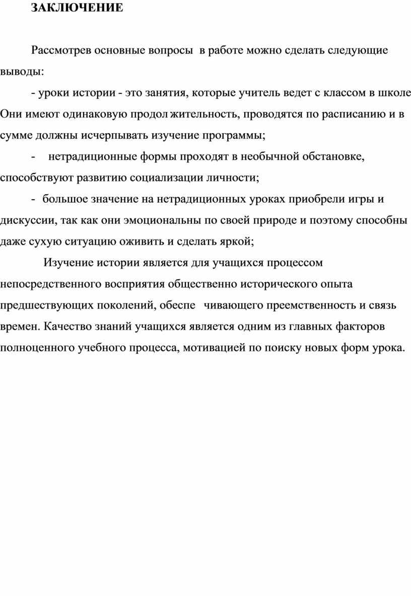 Таким образом, можно сделать вывод о необходимости внедрения в педагогический процесс нетрадиционных форм уроков, так как именно они позволяют сделать учебный процесс действительно привлекательным для учащихся, то есть повысить мотивацию знаний.