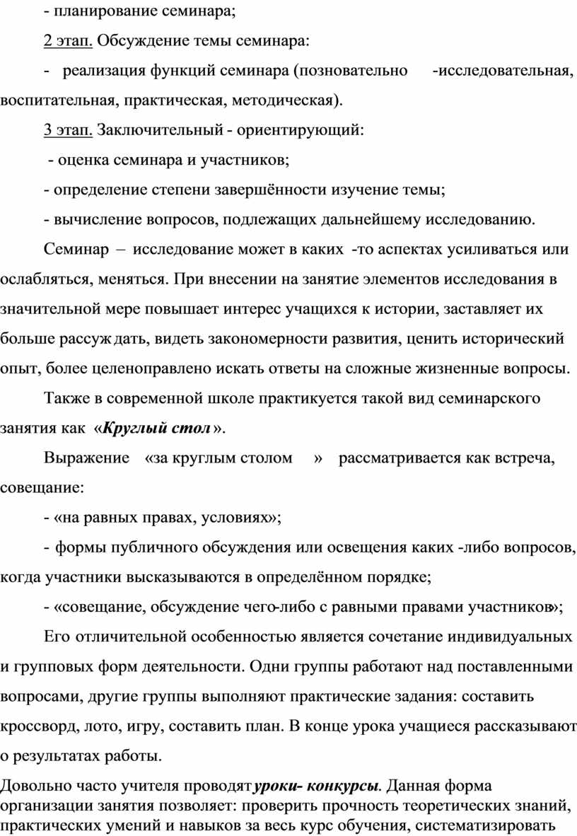 Также в современной школе практикуется такой вид семинарского занятия как «Круглый стол ».