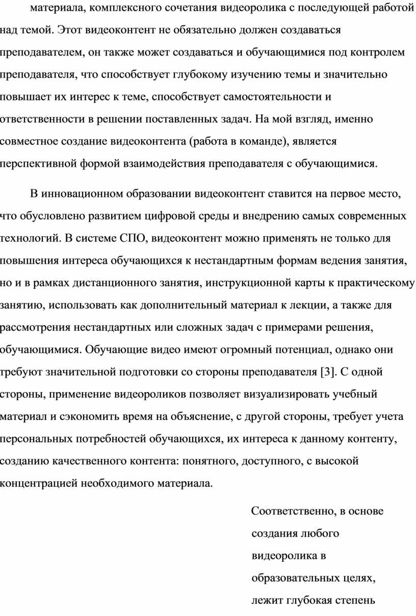 В инновационном образовании видеоконтент ставится на первое место, что обусловлено развитием цифровой среды и внедрению самых современных технологий. В системе СПО, видеоконтент можно применять не только для повышения интереса обучающихся к нестандартным формам ведения занятия, но и в рамках дистанционного занятия, инструкционной карты к практическому занятию, использовать как дополнительный материал к лекции, а также для рассмотрения нестандартных или сложных задач с примерами решения, обучающимися. Обучающие видео имеют огромный потенциал, однако они требуют значительной подготовки со стороны преподавателя [3]. С одной стороны, применение видеороликов позволяет визуализировать учебный материал и сэкономить время на объяснение, с другой стороны, требует учета персональных потребностей обучающихся, их интереса к данному контенту, созданию качественного контента: понятного, доступного, с высокой концентрацией необходимого материала.