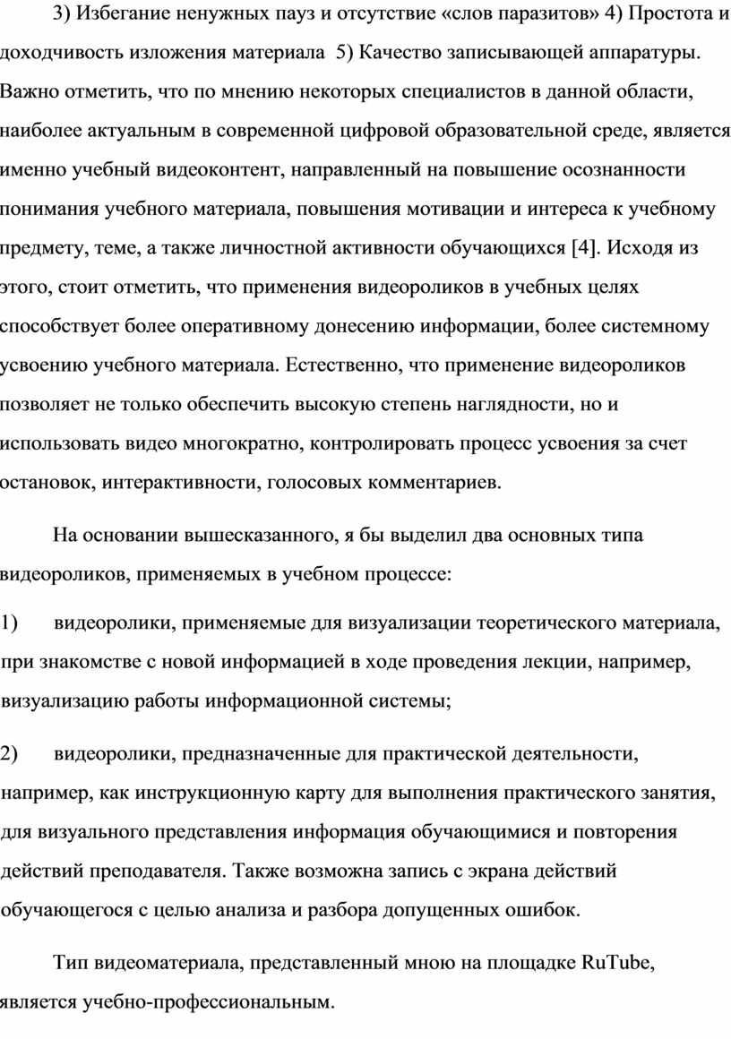Соответственно, в основе создания любого видеоролика в образовательных целях, лежит глубокая степень проработки обучающего продукта, в котором необходимо учитываться целый ряд особенностей для восприятия данного контента. Перечислю основные: 1) Структурирование подачи информации 2) Актуальность и проблемность данной тематики ролика 3) Избегание ненужных пауз и отсутствие «слов паразитов» 4) Простота и доходчивость изложения материала 5) Качество записывающей аппаратуры. Важно отметить, что по мнению некоторых специалистов в данной области, наиболее актуальным в современной цифровой образовательной среде, является именно учебный видеоконтент, направленный на повышение осознанности понимания учебного материала, повышения мотивации и интереса к учебному предмету, теме, а также личностной активности обучающихся [4]. Исходя из этого, стоит отметить, что применения видеороликов в учебных целях способствует более оперативному донесению информации, более системному усвоению учебного материала. Естественно, что применение видеороликов позволяет не только обеспечить высокую степень наглядности, но и использовать видео многократно, контролировать процесс усвоения за счет остановок, интерактивности, голосовых комментариев.