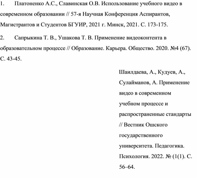 6. Шаилдаева, А., Кудуев, А., Сулайманов, А. Применение видео в современном учебном процессе и распространенные стандарты // Вестник Ошского государственного университета. Педагогика. Психология. 2022. № (1(1). С. 56–64.
