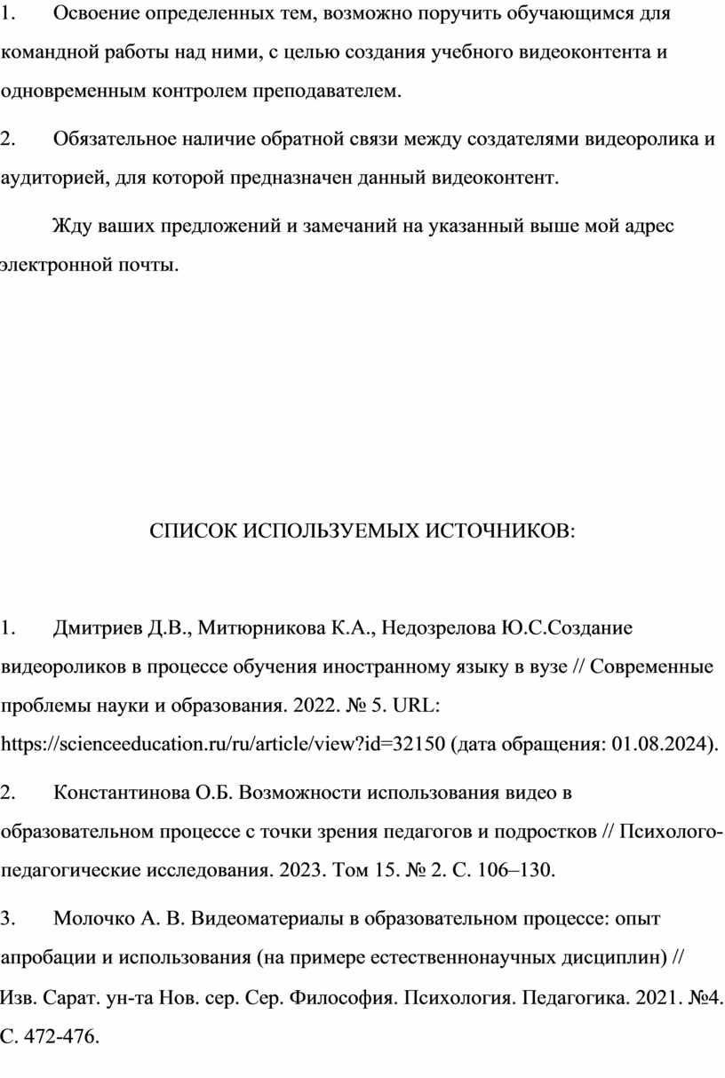 2. Константинова О.Б. Возможности использования видео в образовательном процессе с точки зрения педагогов и подростков // Психолого-педагогические исследования. 2023. Том 15. № 2. С. 106–130.