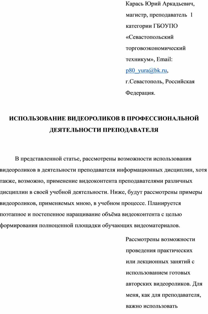В представленной статье, рассмотрены возможности использования видеороликов в деятельности преподавателя информационных дисциплин, хотя также, возможно, применение видеоконтента преподавателями различных дисциплин в своей учебной деятельности. Ниже, будут рассмотрены примеры видеороликов, применяемых мною, в учебном процессе. Планируется поэтапное и постепенное наращивание объёма видеоконтента с целью формирования полноценной площадки обучающих видеоматериалов.