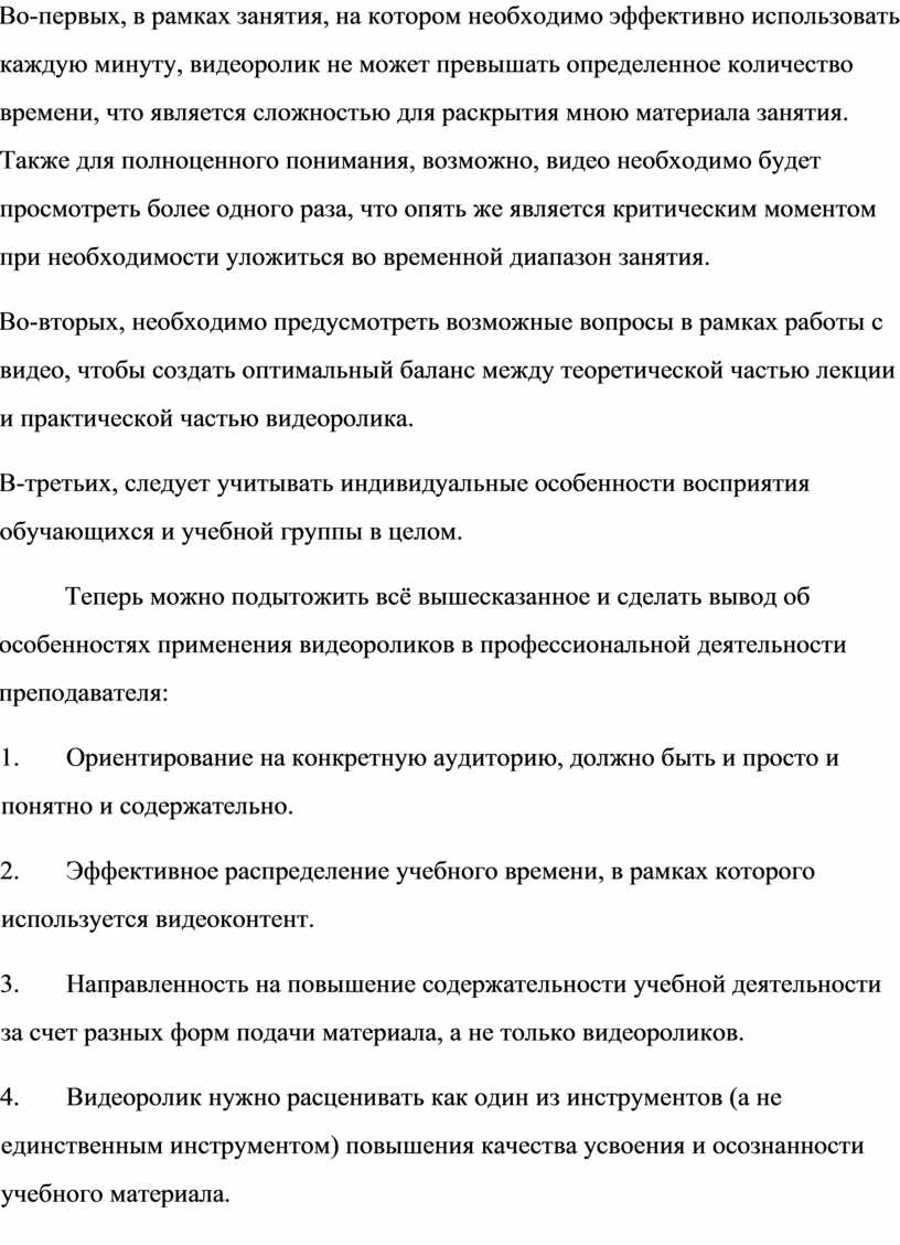 Теперь можно подытожить всё вышесказанное и сделать вывод об особенностях применения видеороликов в профессиональной деятельности преподавателя:
