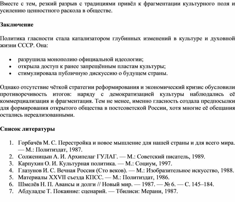 плюрализм мнений. Данная статья анализирует влияние гласности на культуру и