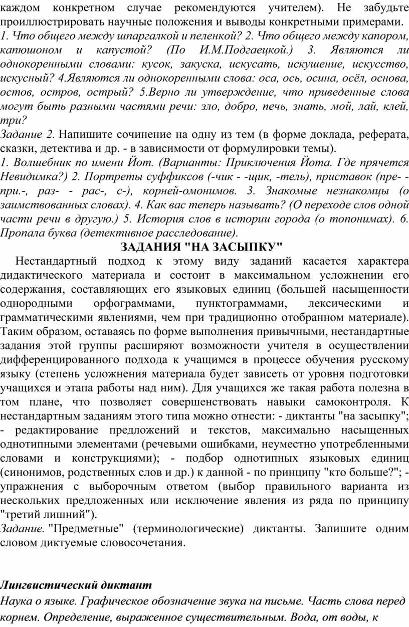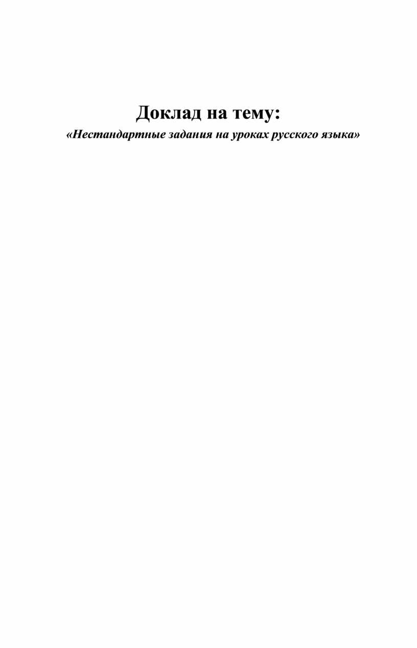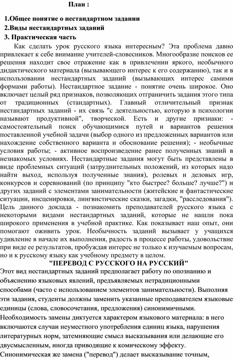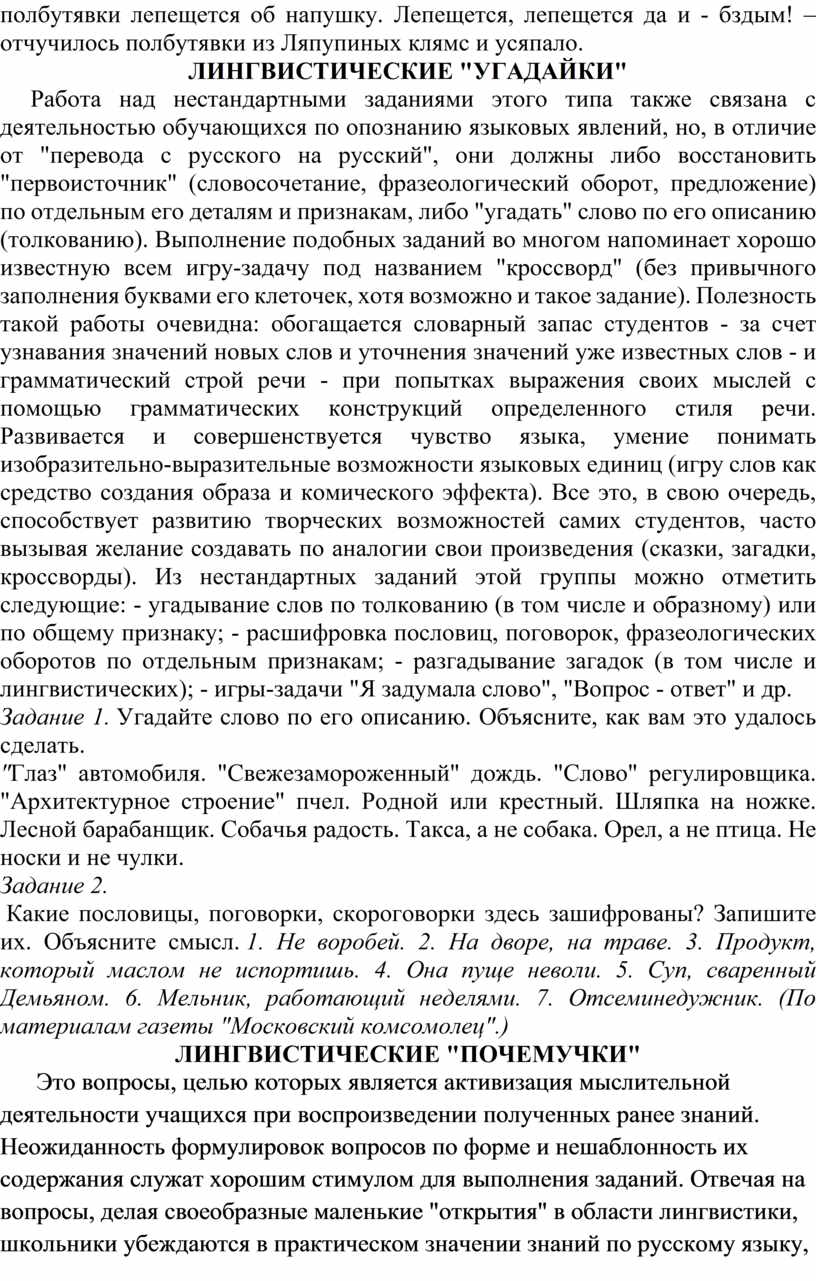 Как сделать урок русского языка интересным? Эта проблема давно привлекает к себе внимание учителей-словесников. Многообразие поисков ее решения находит свое отражение как в привлечении яркого, необычного дидактического материала (вызывающего интерес к его содержанию), так и в использовании нестандартных заданий (вызывающих интерес самими формами работы). Нестандартное задание - понятие очень широкое. Оно включает целый ряд признаков, позволяющих отграничить задания этого типа от традиционных (стандартных). Главный отличительный признак нестандартных заданий - их связь "с деятельностью, которую в психологии называют продуктивной", творческой. Есть и другие признаки: - самостоятельный поиск обучающимися путей и вариантов решения поставленной учебной задачи (выбор одного из предложенных вариантов или нахождение собственного варианта и обоснование решения); - необычные условия работы; - активное воспроизведение ранее полученных знаний в незнакомых условиях. Нестандартные задания могут быть представлены в виде проблемных ситуаций (затруднительных положений, из которых надо найти выход, используя полученные знания), ролевых и деловых игр, конкурсов и соревнований (по принципу "кто быстрее? больше? лучше?") и других заданий с элементами занимательности (житейские и фантастические ситуации, инсценировки, лингвистические сказки, загадки, "расследования"). Цель данного доклада - познакомить преподавателей русского языка с некоторыми видами нестандартных заданий, которые не нашли пока широкого применения в учебной практике. Как показывает наш опыт, они помогают оживить урок. Необычность заданий вызывает у учащихся удивление в начале их выполнения, радость в процессе работы, удовольствие при виде ее результатов, пробуждая интерес не только к изучаемым вопросам, но и к русскому языку как учебному предмету в целом.