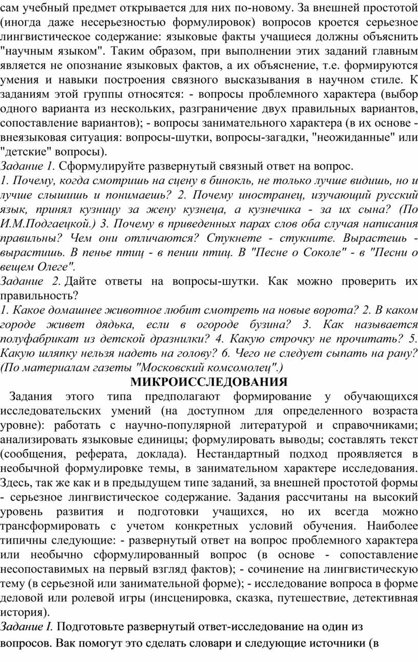 Задания этого типа предполагают формирование у обучающихся исследовательских умений (на доступном для определенного возраста уровне): работать с научно-популярной литературой и справочниками; анализировать языковые единицы; формулировать выводы; составлять текст (сообщения, реферата, доклада). Нестандартный подход проявляется в необычной формулировке темы, в занимательном характере исследования. Здесь, так же как и в предыдущем типе заданий, за внешней простотой формы - серьезное лингвистическое содержание. Задания рассчитаны на высокий уровень развития и подготовки учащихся, но их всегда можно трансформировать с учетом конкретных условий обучения. Наиболее типичны следующие: - развернутый ответ на вопрос проблемного характера или необычно сформулированный вопрос (в основе - сопоставление несопоставимых на первый взгляд фактов); - сочинение на лингвистическую тему (в серьезной или занимательной форме); - исследование вопроса в форме деловой или ролевой игры (инсценировка, сказка, путешествие, детективная история).