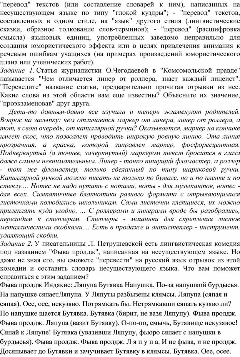 Этот вид нестандартных заданий предполагает работу по опознанию и объяснению языковых явлений, предъявляемых нетрадиционными способами (часто с использованием элементов занимательности). Выполняя эти задания, студенты должны заменить указанные преподавателем языковые единицы (слова, словосочетания, предложения) синонимичными. Необходимость замены диктуется характером языкового материала: в него включаются случаи неуместного употребления единиц языка, нарушения литературных норм, затемняющие смысл высказывания или делающие его двусмысленным, иногда приводящие к комическому эффекту. Синонимическая же замена ("перевод") делает высказывание точным, понятным, правильным. К нестандартным заданиям этого типа относятся: - "перевод" иноязычных, профессиональных, устаревших, жаргонных слов; - "перевод" текстов (или составление словарей к ним), написанных на несуществующем языке по типу "глокой куздры"; - "перевод" текстов, составленных в одном стиле, на "язык" другого стиля (лингвистические сказки, образное толкование слов-терминов); - "перевод" (расшифровка смысла) языковых единиц, употребленных заведомо неправильно для создания юмористического эффекта или в целях привлечения внимания к речевым ошибкам учащихся (на примерах произведений юмористического плана или ученических работ).