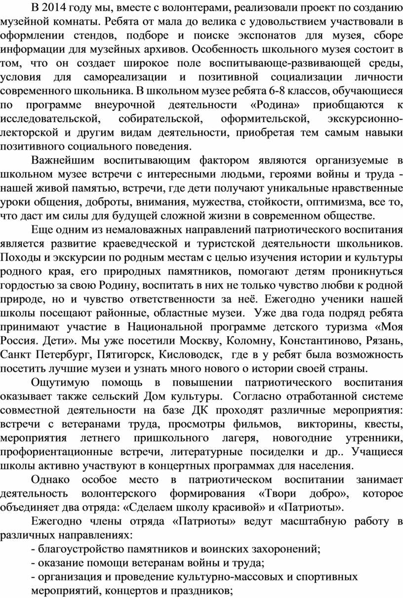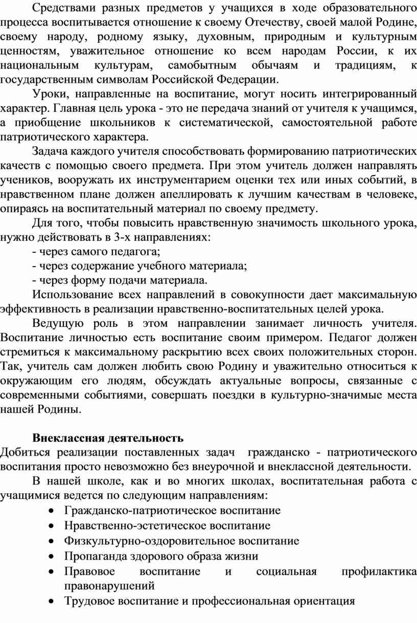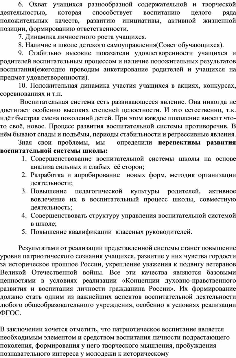 Вышеизложенные позиции вошли в сложившуюся систему гражданско-патриотического воспитания в нашей школе. Основой этого воспитания является, безусловно, учебно-воспитательный процесс, изучение программного материала в ходе преподавания учебных дисциплин. Но немаловажным звеном в гражданско-патриотическом воспитании школьников является его непрерывность, целостность, чёткость взаимодействия всех заинтересованных структур. Организация работы осуществляется в содружестве с местным Домом культуры, Администрацией поселения, Советом молодежи района.